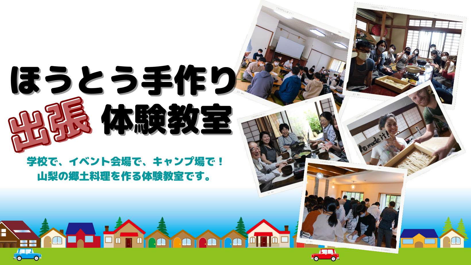 日頃は富士山の麓で山梨を代表する郷土料理「ほうとう」を作る体験教室をしています。出張ほうとう作り体験教室では、学校・イベント会場・キャンプ場・会社の会議室・施設など様々な場所に出張いたします。